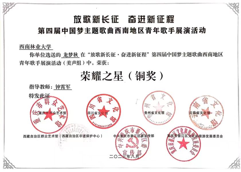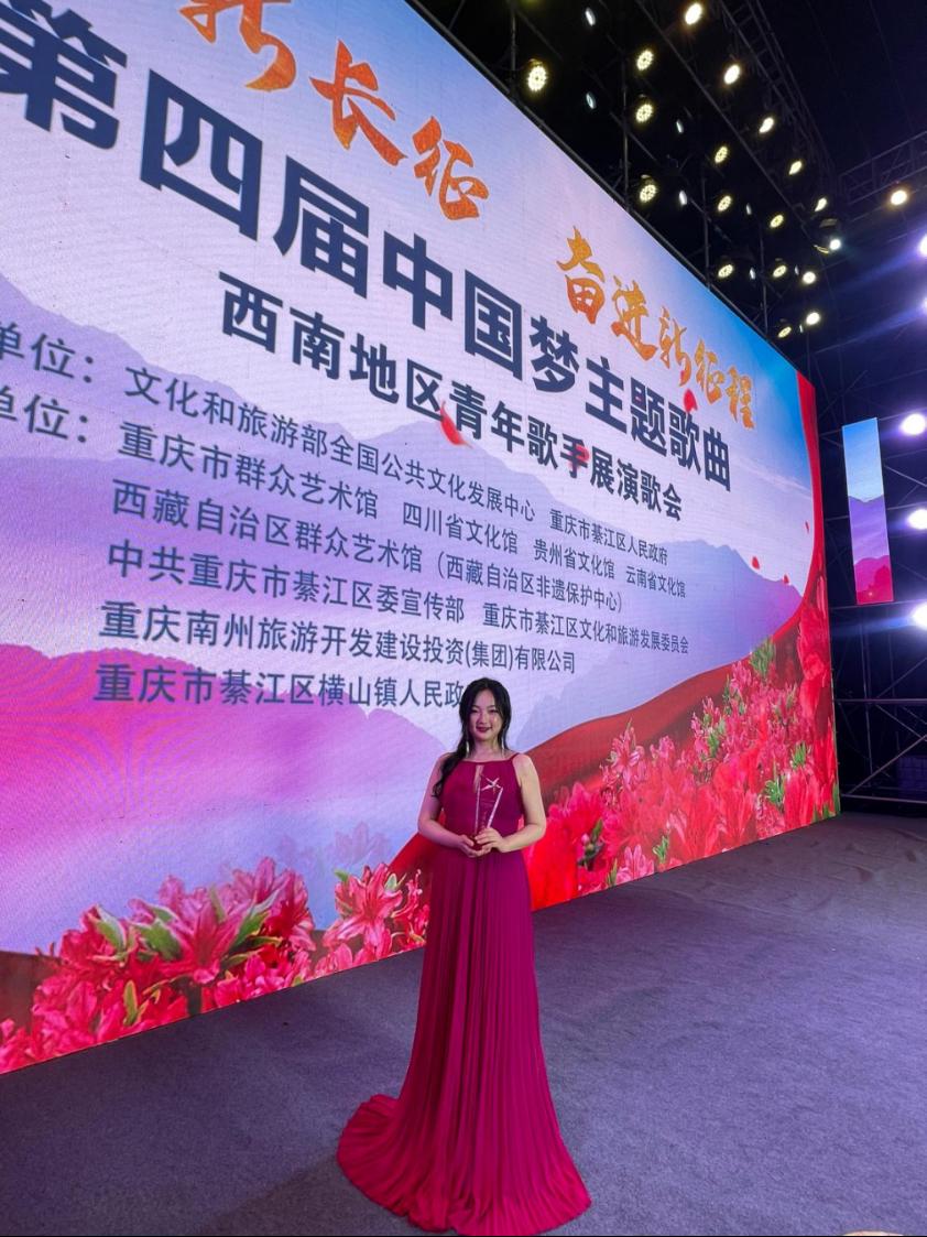 近日,必威西汉姆官网平台教师龙梦秋受云南省文化馆邀请,代表云南省赴重庆市参加“放歌新长征·奋进新征程”第四届中国梦主题 歌曲西南地区青年歌手展演活动,荣获“荣耀之星”铜奖。
