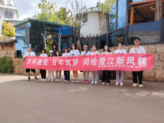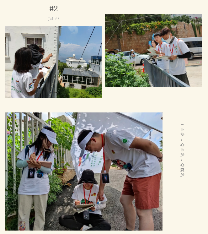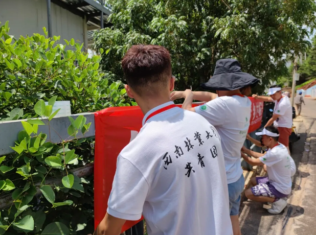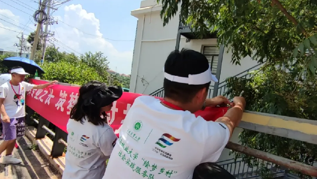 在考察学习小湾期间,实践队员在村内悬挂横幅—“发挥专业之长,筑梦乡村振兴”,利用实践队员各自所学专业优势,充分了解小湾的环境特点并结合实际进行绘画创作,充分展现名宿示范村的优美生态环境,为乡村振兴添上一笔色彩。