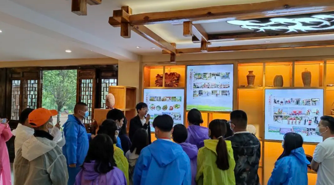 早晨,19名实践人员到达右所镇吉花社区马房村,一路上虽细雨不断,但大家却热情不减。马房村党群服务中心讲解员李杰为大家讲解马房村简介、生态文明、乡村振兴等建设发展情况。马房村始终牢固树立“绿水青山就是金山银山”的理念,按照“绿色低碳、保护治理、高质量发展”的思路,坚持党建引领,加大农业产业结构调整力度,建设以荷藕种植为主的生产性湿地,积极探索产村、农旅融合绿色发展新路子,打造以田园观光、 休闲体验为主题的马房村民宿客栈、餐饮乡村旅游集聚区。在乡村振兴方面,马房村以产业振兴,人才振兴,生态振兴,文化振兴,组织振兴五个方面开展,致力培养文明良好村风,淳朴家风民风的美丽乡村建设。