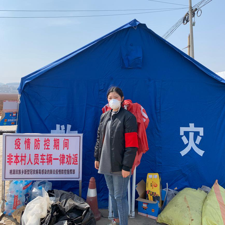 2019级环境设计3班的米曼同学,疫情期间,在云南省昭通市鲁甸县大水塘村疫情防控关卡做志愿者服务工作,配合医务人员给外来人员登记,测量体温,督促出入人员扫码,积极宣传防疫工作相关知识,对疫区人员劝返。作为一名当代老员工,米曼积极投身疫情防控,尽职尽责,尽己所能,守护家乡人民的生命安全。