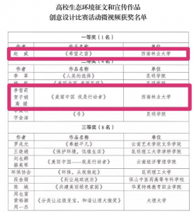 为把云南建设成为中国最美丽省份,倡导社会各界和大众身体力行,从选择简约适度、绿色低碳的生活方式做起,知行合一,参与美丽中国建设,让“绿水青山就是金山银山”的发展理念在云岭大地落地生根,云南省生态环境厅、云南省教育厅于2019年5月5日至20日面向全省高校开展了“美丽中国-我是行动者”生态环境征文和宣传作品创意设计比赛。自活动启动以来,共征集生态环境征文作品616篇,生态环境宣传海报挂图393件、微视频76个。按照公平、公正、公开原则,经过征集初选、专家评审和官网公示,评选出征文组一等奖1名、二等奖5名、三等奖10名、优秀奖22名,海报挂图组一等奖1名、二等奖5名、三等奖10名、优秀奖10名;微视频组一等奖1名、二等奖4名、三等奖8名、优秀奖7名。
