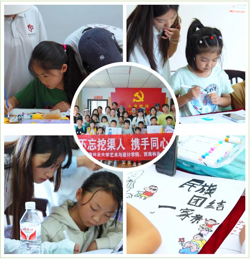 在 “民族同心共筑未来”支教活动中,“藝树石榴红”实践团深入腾冲明德小学,勐宋童心港湾及南本老寨农户家中,玉碗镇老街村、出水村、石灰村等开展“童心稚手绘就同心圆”“大手拉小手,共绘同心圆”等主题支教活动。实践团成员精心准备并为孩子们赠发了文具礼包,带领孩子们绘画创作,以色彩为桥,共绘民族团结的宏伟画卷。